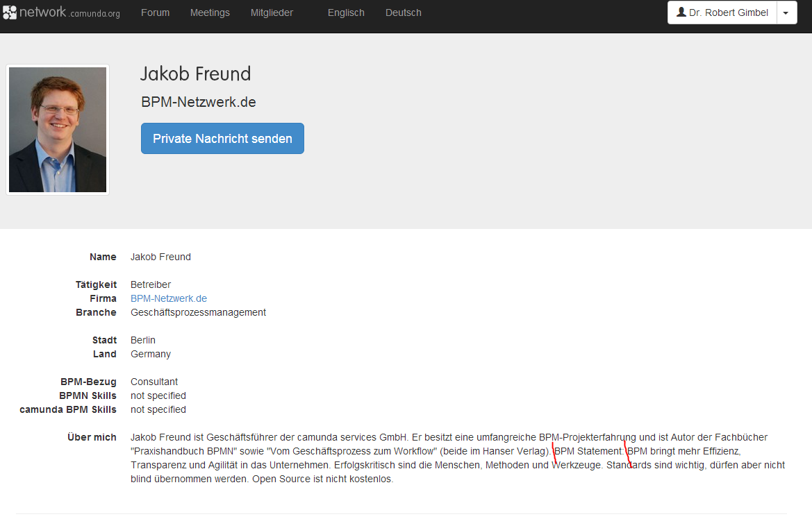 - visit profile page (e.g. http://network.camunda.org/members/7/profile)